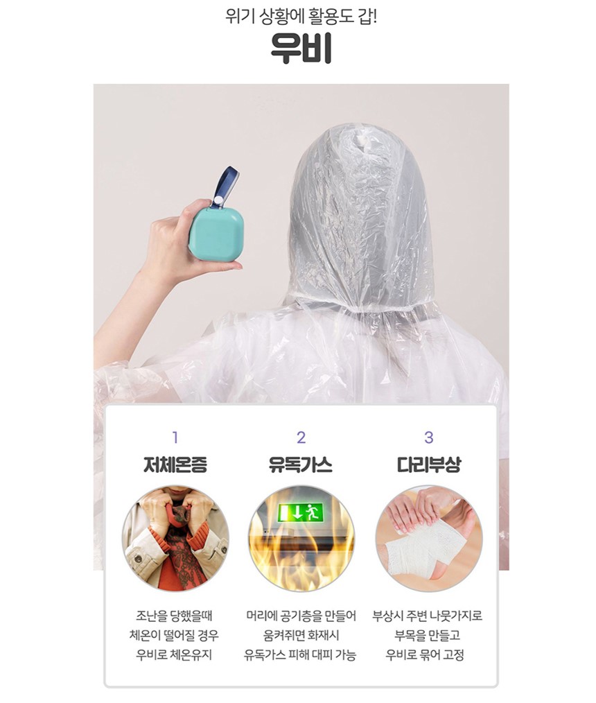 저체온증방지, 화재시 산소층 확보, 비를 피하는 용도로 사용합니다 .